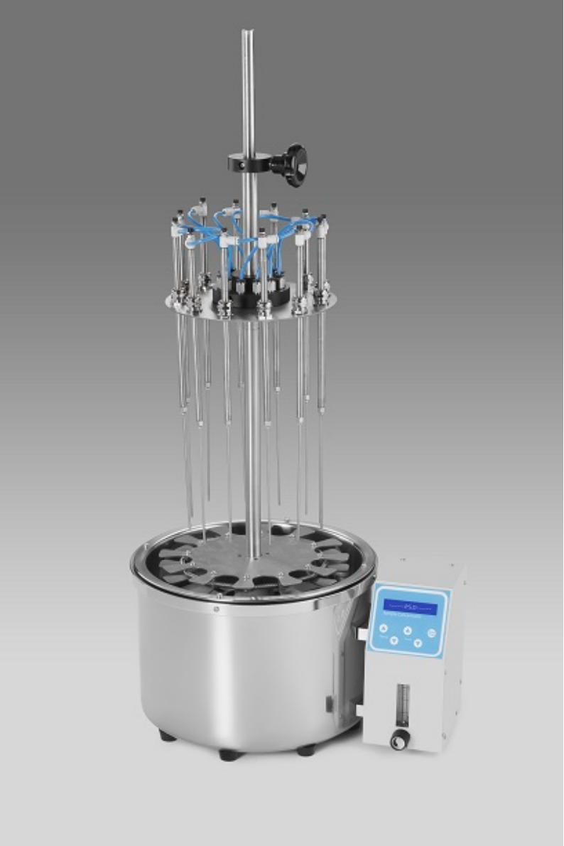 The Water Bath Sample Concentration consists of a base and supporting assembly, sample holder and gas distribution system. Test tubes are placed by a spring-loaded sample holder and support tray. The gas passes through the flow meter to the distribution system. Flexible tubing leads gas to valve-tube assemblies at each position. Depending on the test-tube size and solvent volume, they can be individually raised or lowered to the correct height. Needles blow gas onto the surface of the solution resulting in rapid evaporation of the solvent.